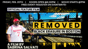 Join us for a free community screening of REMOVED: Black Erasure in Boston, an official feature film by Sabrina Salvati exploring the history and impact of Black displacement and erasure in Boston.