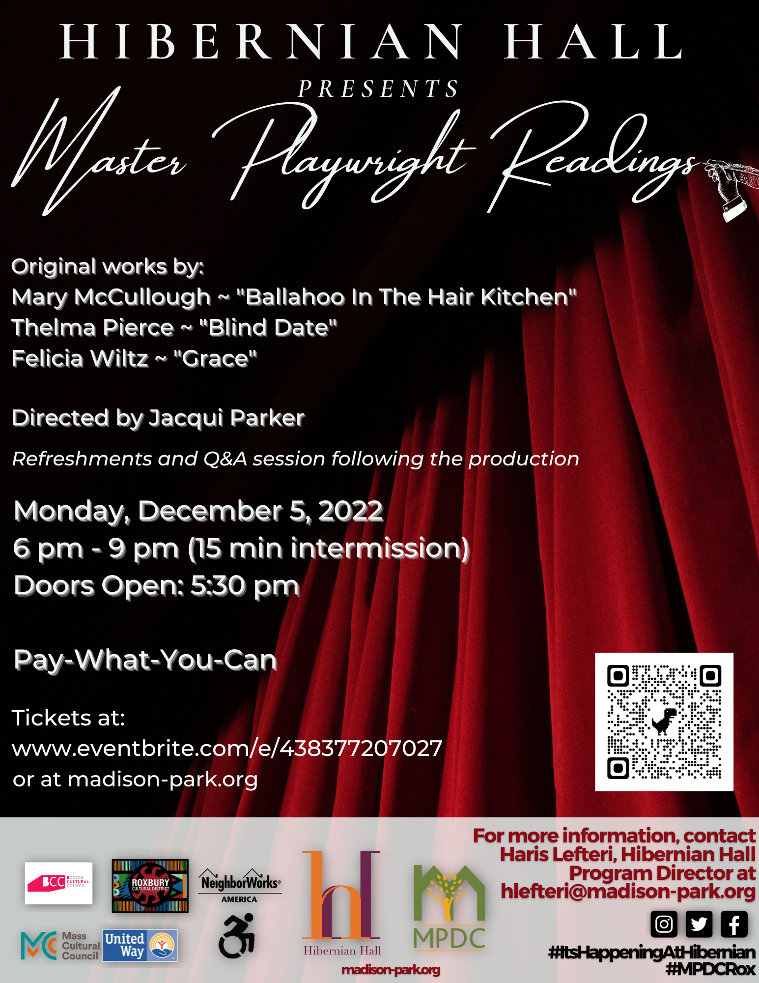 About Master Playwright Readings:Hibernian Hall hosts a night of Master Playwright Readings directed by Jacqui Parker. Original works by Mary McCullough, Thelma Piere, and Felicia Wiltz will be featured. Refreshments will also be served and a Q&A session will follow the readings!